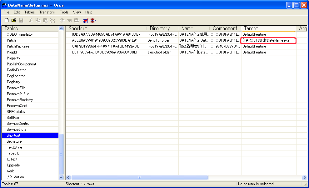 - 左のTablesの"Shortcut"をクリックし、Directoryが"SendToFolder"のフィールドの、Targetを"DefaultFeature"から"[TARGETDIR]\<appname>"に置き換える。